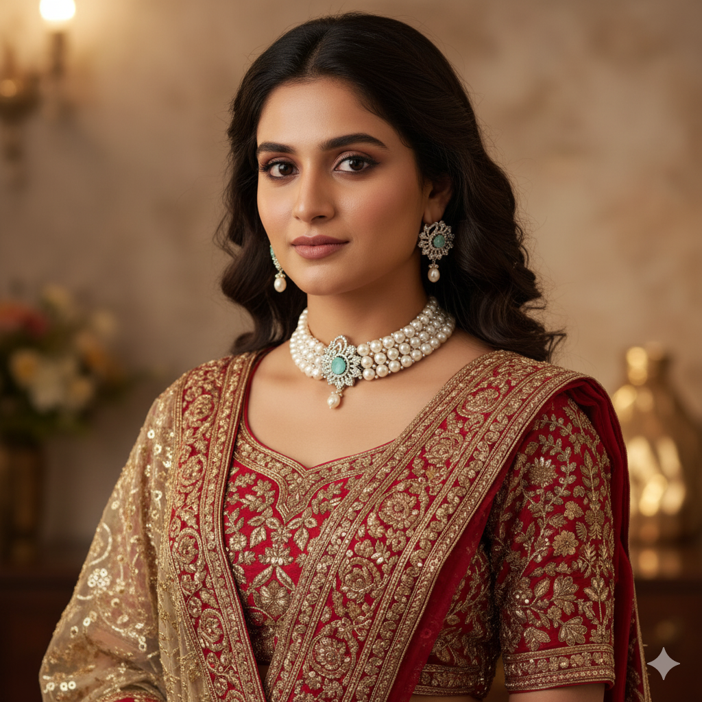To add a unique charm, this design includes a delicate pearl necklace pendant at the center. The pendant acts as a focal point, drawing attention to the neckline and adding a touch of individuality. Some designs feature single pearls, while others combine pearls with gold, silver, or gemstone detailing for extra brilliance. Whether you prefer minimal elegance or rich traditional style, the pendant gives the choker a stunning finishing touch.