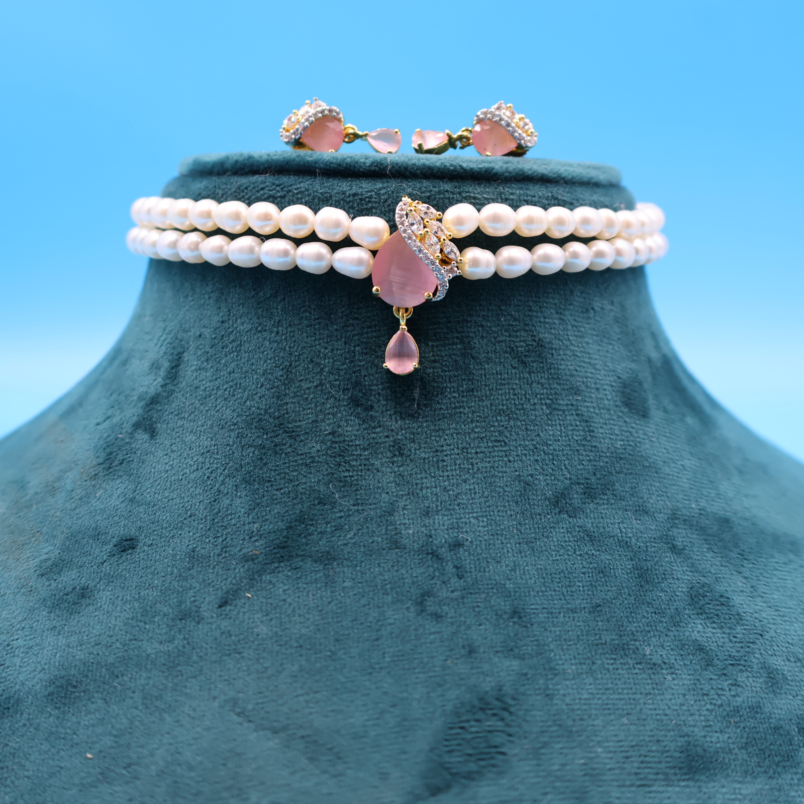 CZ Pink Stone Pearl Choker Set