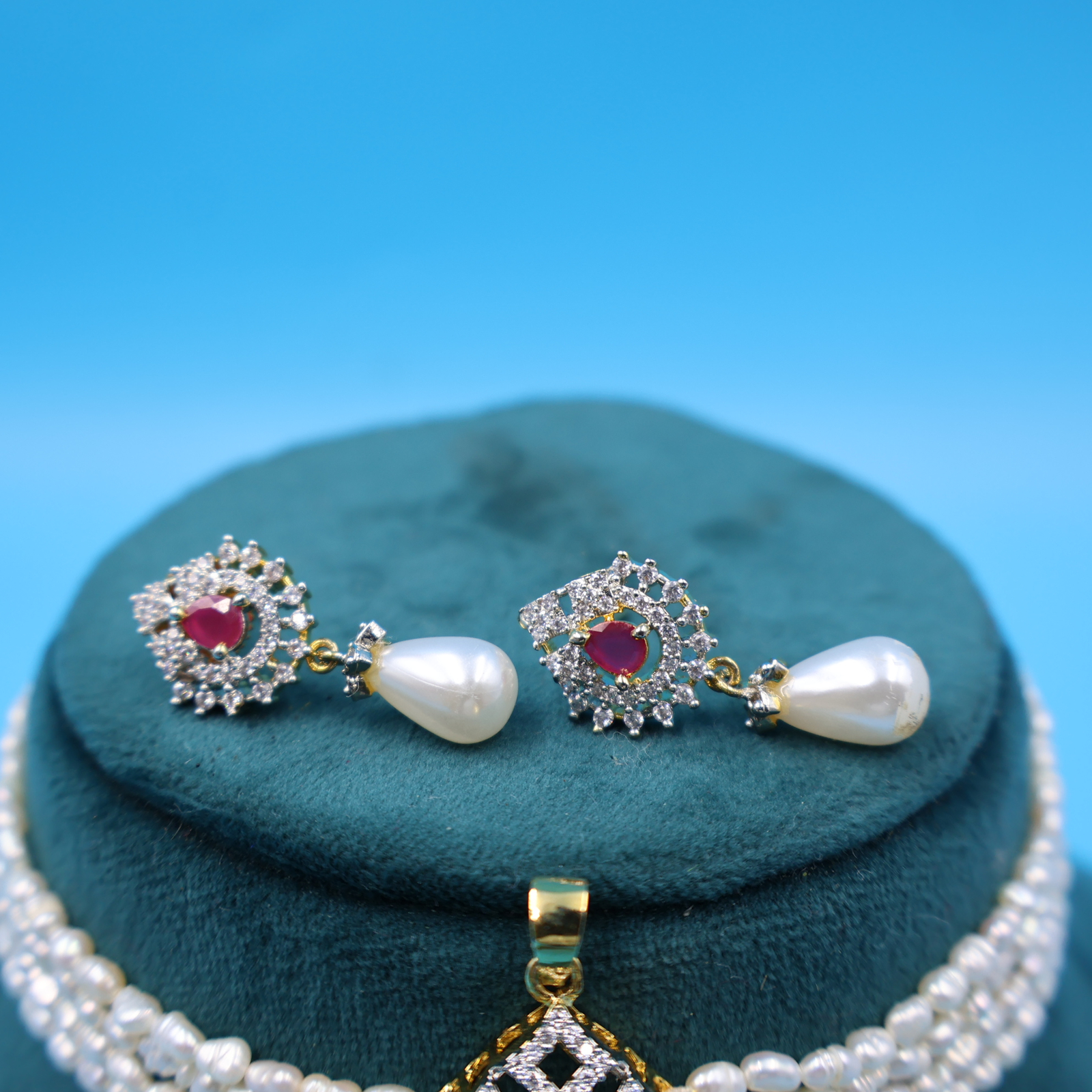 CZ Ruby Pendant Rice Pearl Choker Set
