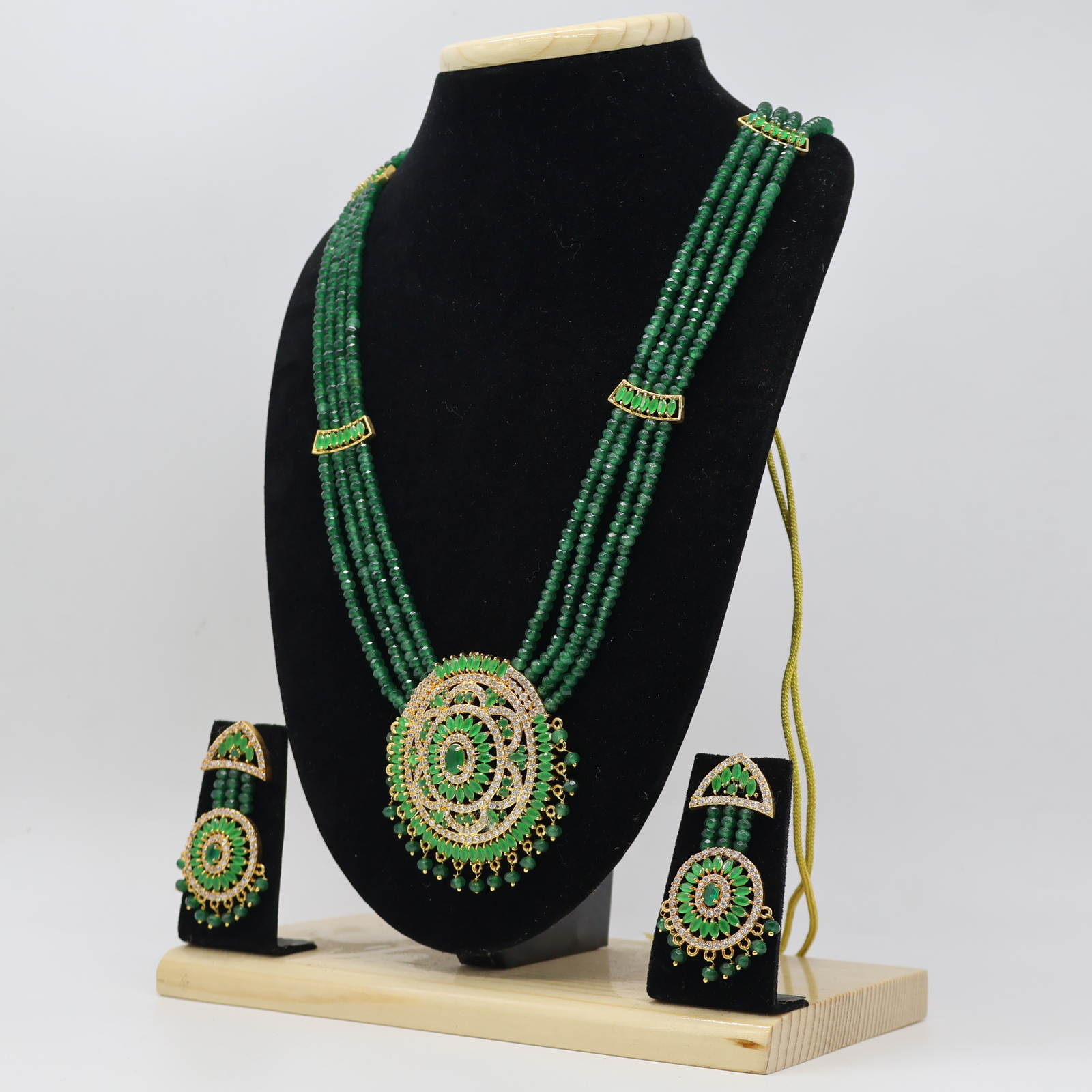 Our Rani Haar Pearl Necklace Sets are crafted with layers of high quality pearls that exude a natural shine and elegance. The necklace often extends long, gracefully adorning the neckline and chest, making it ideal to pair with sarees, lehengas, and bridal gowns. Depending on the design, it may feature pendants with precious stones like emeralds, rubies, or kundan work, adding an extra touch of richness.