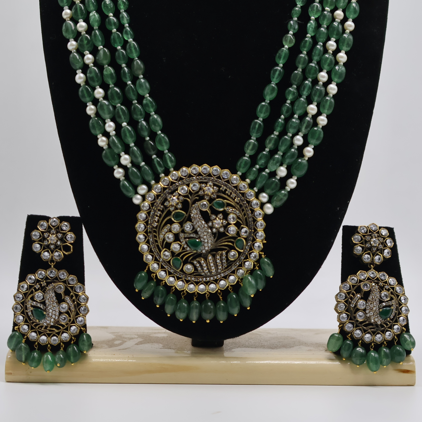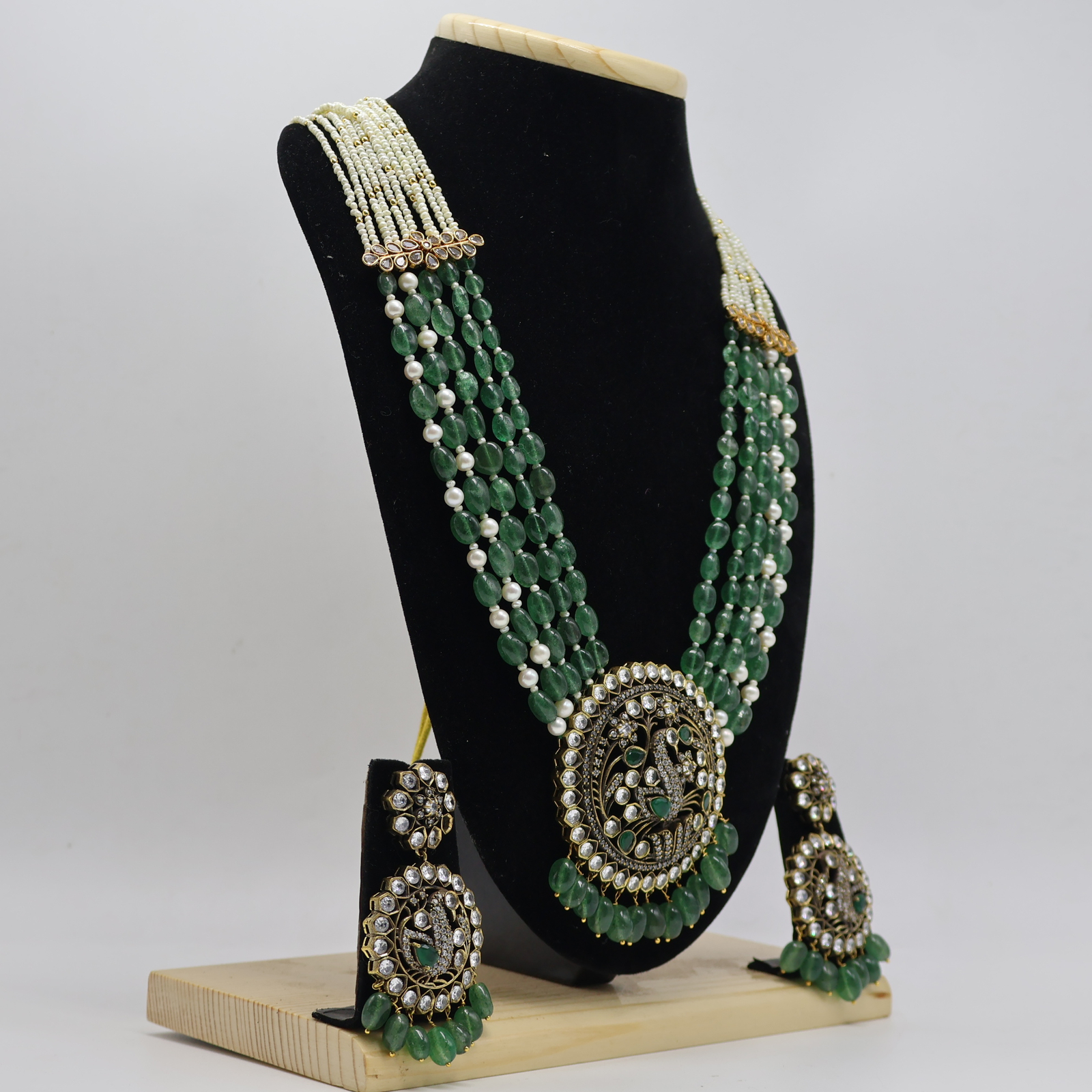 Elevate your royal charm with our Unique Rani Haar Antique Pendant Emerald Pearl Necklace, an exquisite piece of jewelry that beautifully blends timeless tradition with regal elegance. Designed for women who appreciate heritage craftsmanship and luxury, this Rani Haar is a masterpiece that embodies the cultural richness of India and the everlasting allure of pearls.