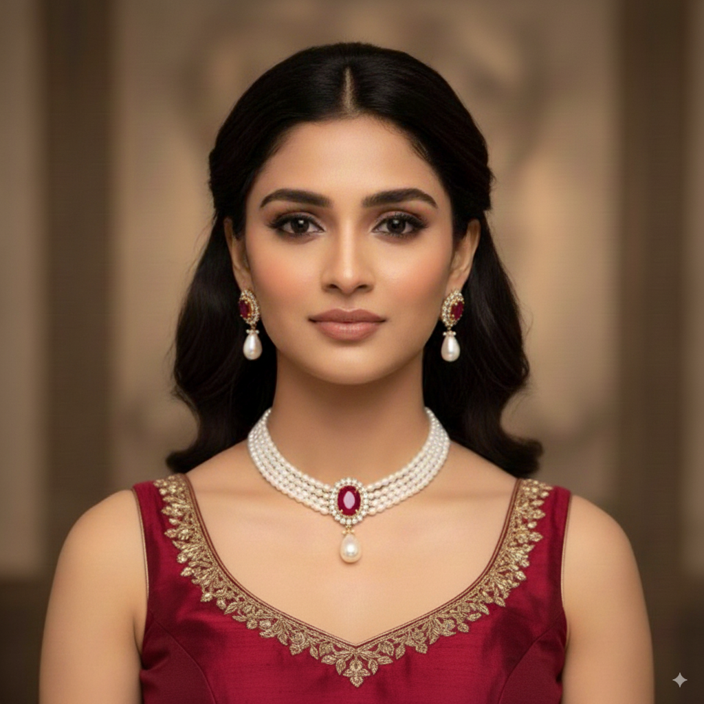 Each pearl choker necklace in our collection is made with real pearls, hand-selected for their natural shine, smooth surface, and round shape. Unlike artificial imitations, real pearls carry a glow that reflects class and authenticity. Wearing this necklace instantly elevates your look, whether paired with a saree, lehenga, or even a western outfit.