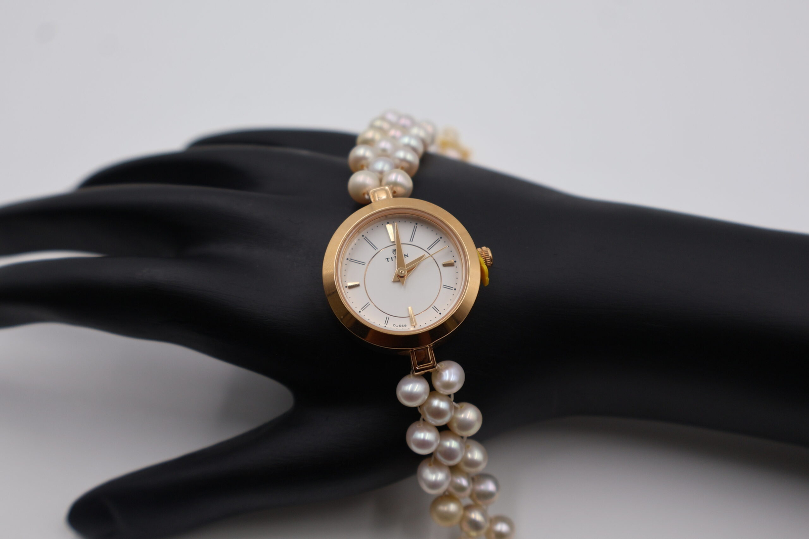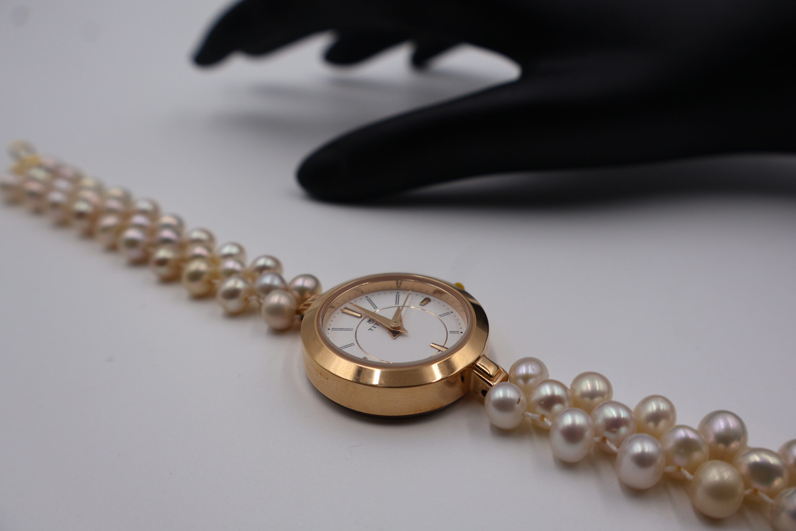 Every detail of the Pearl Watch speaks luxury. The bezel is delicately adorned with lustrous pearls, each carefully handpicked for its radiant sheen, smooth texture, and flawless roundness. Their natural glow is beautifully complemented by the polished metal casing, creating a balanced design that feels both timeless and contemporary. The result is a piece of jewelry that also tells time with impeccable accuracy.