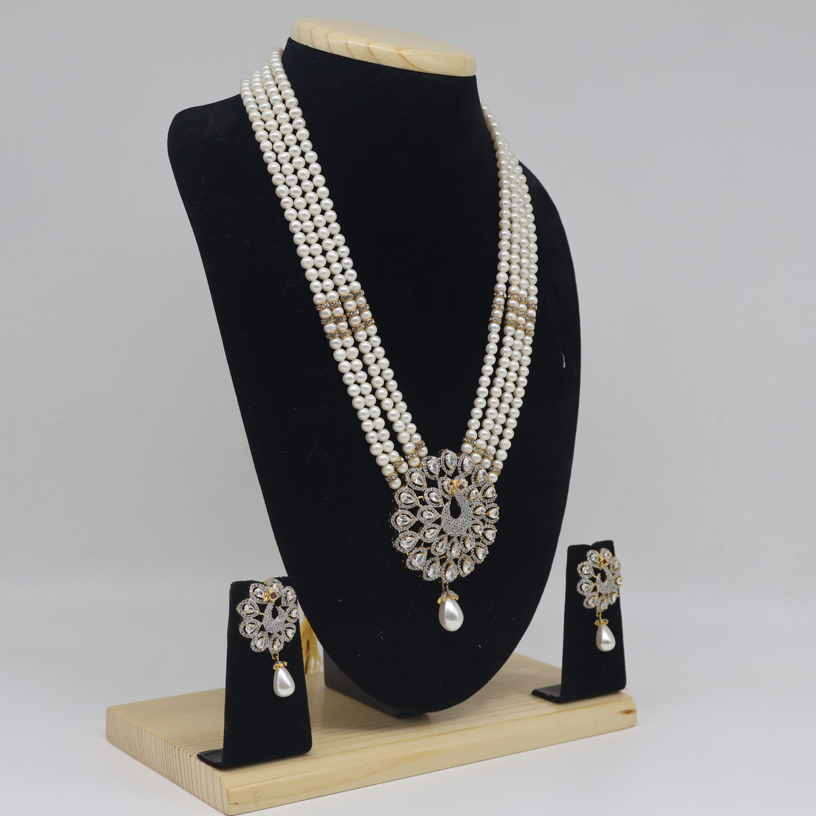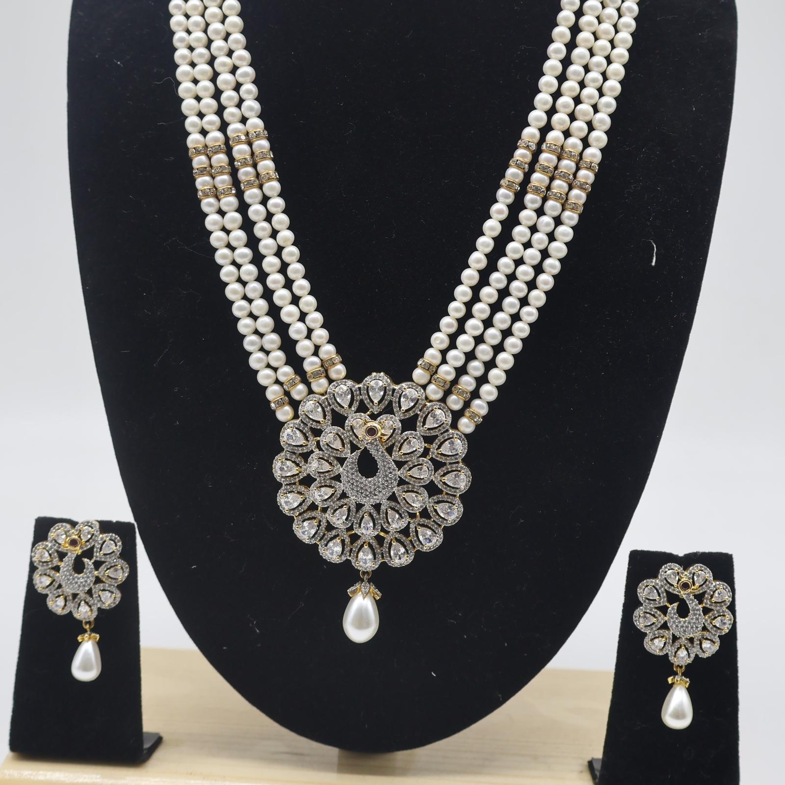 This is not just a necklace it’s a complete set that comes with matching pearl earrings. The earrings mirror the pendant design, creating a harmonious balance that ties the whole look together. Whether you are preparing for a wedding, an engagement party, or a festive gathering, this coordinated set ensures you stand out with effortless elegance.