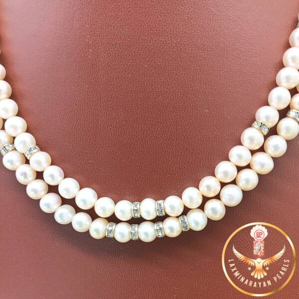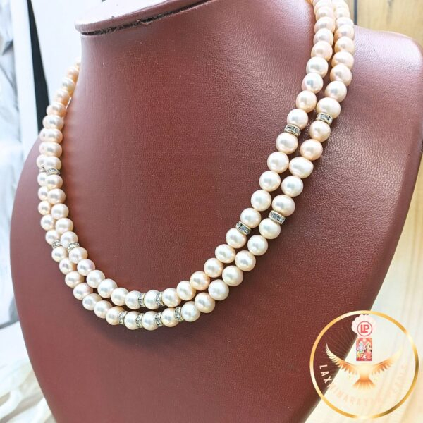 Adding a signature touch of cultural heritage is the double layer pearl necklace a beautifully detailed, circular motif that takes inspiration from the ancient Indian chakra, symbolizing wholeness, unity, and eternal motion. The Chakri is masterfully crafted and adorned with sparkling cubic zirconia or traditional polki stones, arranged to catch the light and draw attention to the centerpiece with dazzling brilliance. Some variations also feature a central colored gemstone, such as a soft rose quartz, ruby, or pastel-toned kundan, to harmonize with the blush-pink pearls.