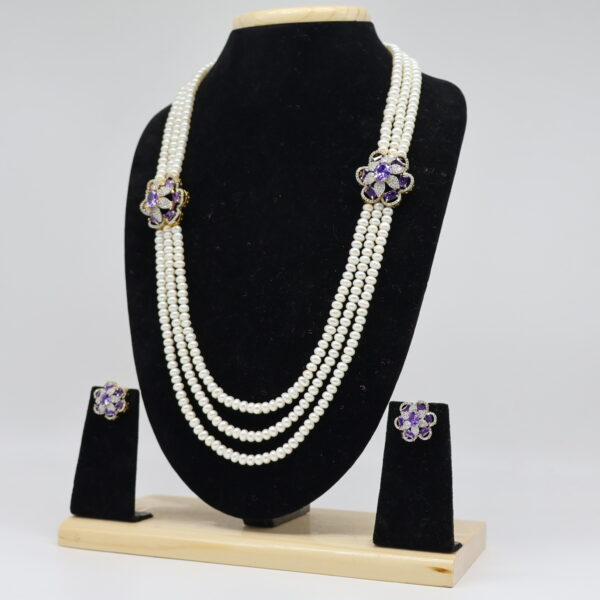 At the heart of this set is a string of hand-selected, luminous pearls, artfully arranged to create a smooth, flawless silhouette. Unlike traditional pearl sets, this design features a stylized side brooch, crafted with intricate detailing, which instantly draws the eye and adds a layer of depth and artistry. The brooch is adorned with glimmering stones or crystals (based on the variant), which beautifully contrast the soft sheen of the pearls, creating a luxurious visual appeal.