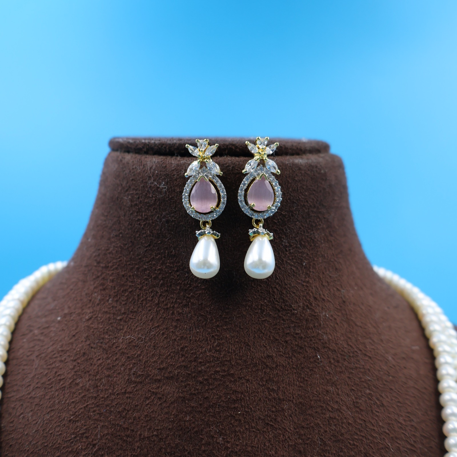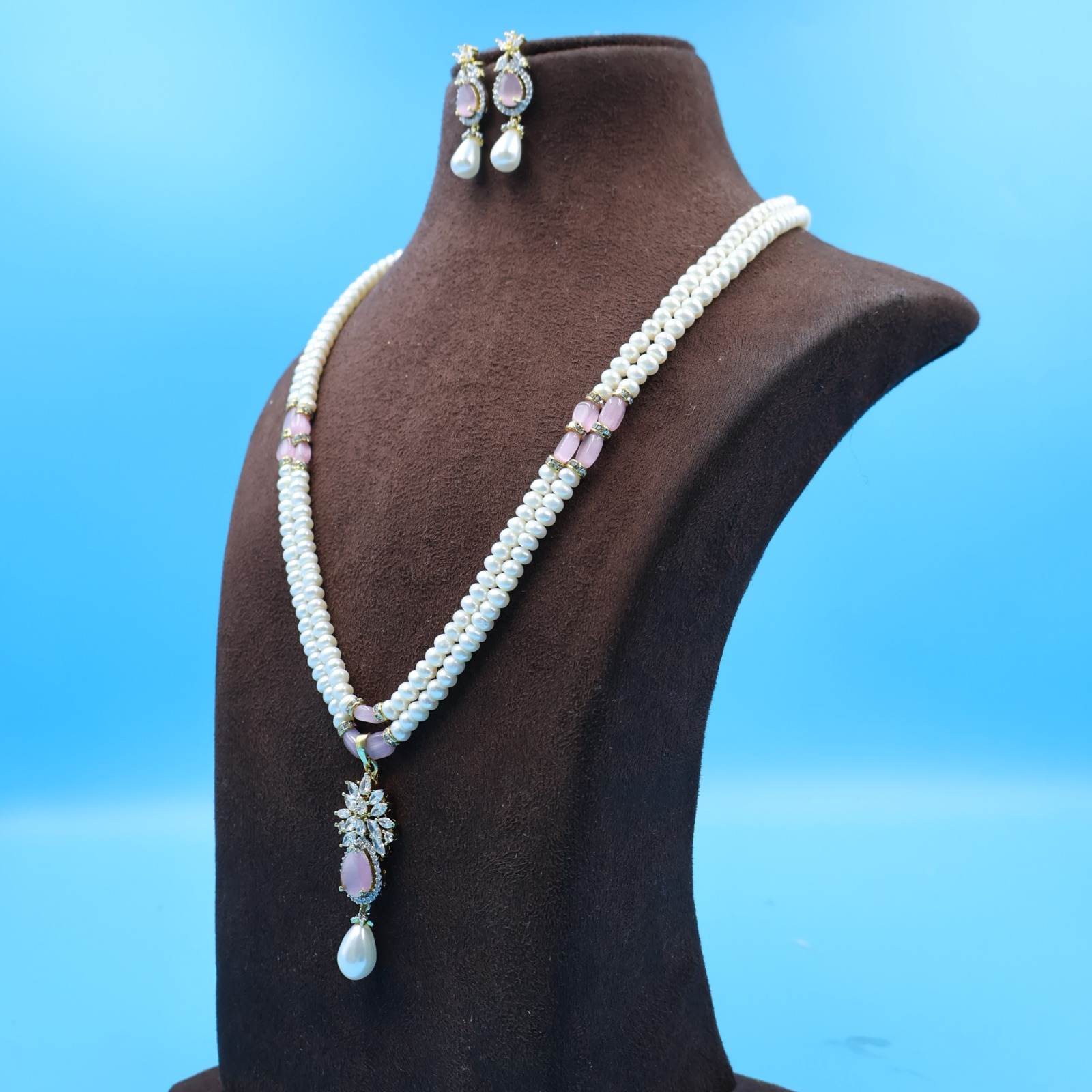 The Design: The necklace features a unique “Double Pendant” concept, crafted from a durable silver alloy with a premium gold-plated finish. The intricate metalwork is studded with radiant Semi-Ruby stones and sparkling American Diamonds (AD), creating a rich contrast against the white pearls. The set includes matching earrings to complete the royal look.
