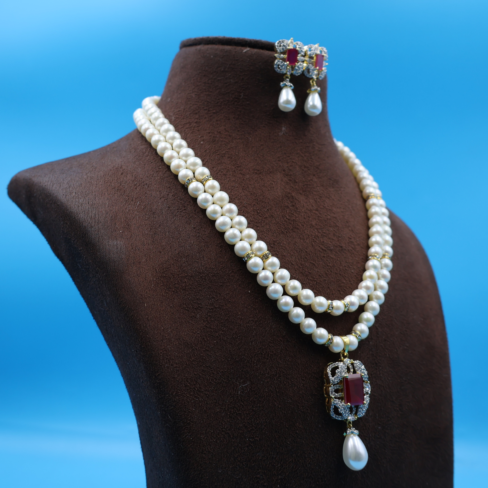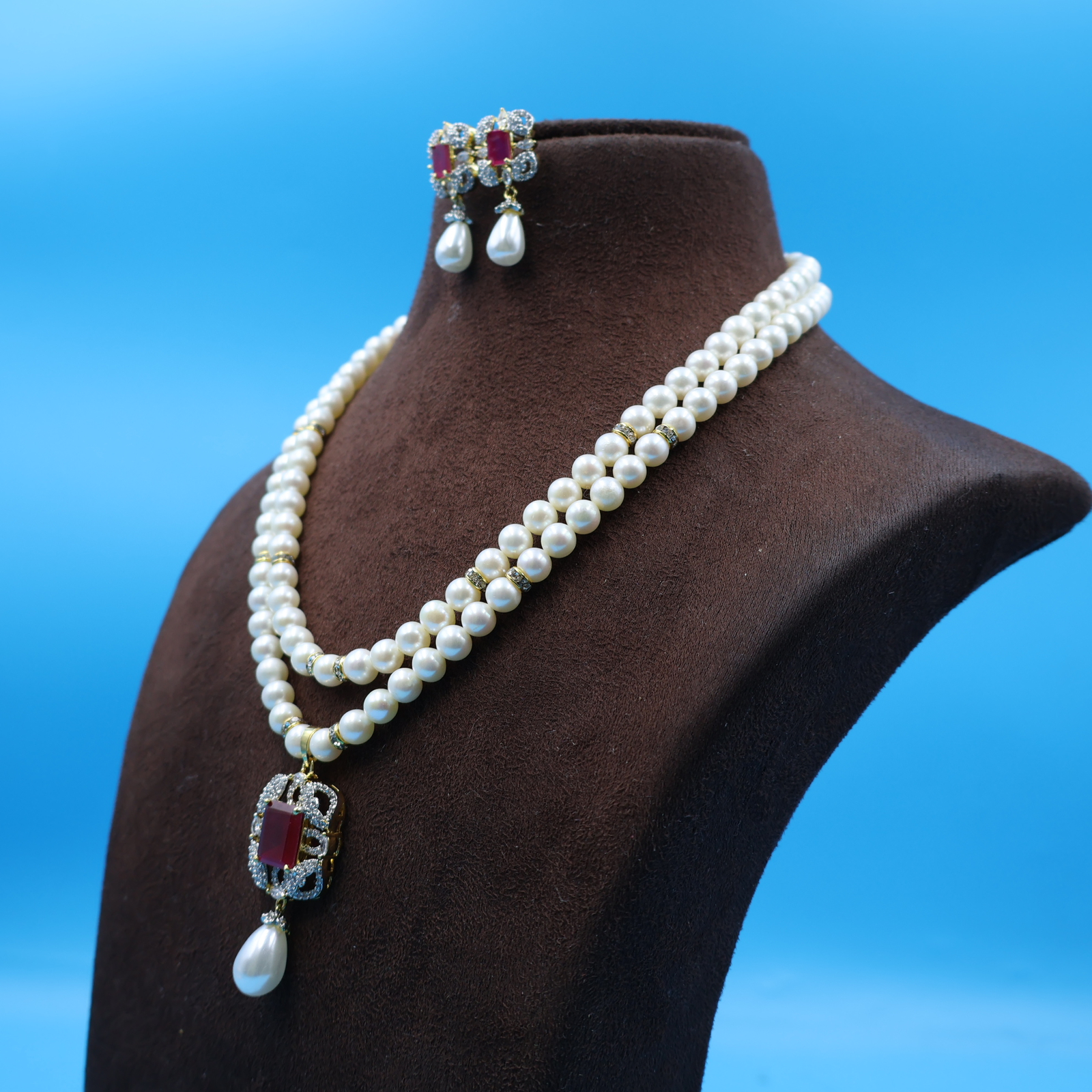 Ruby Pendant Pearl Necklace Set