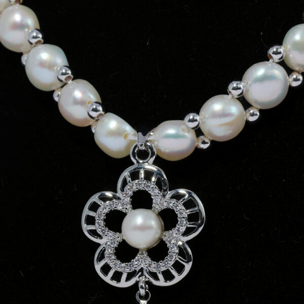 Our collection features a white pearl necklace that embodies classic charm and versatility. White pearls have long been a symbol of purity, sophistication, and timeless beauty, making them a must-have in every jewelry collection. The soft, radiant glow of each pearl reflects light effortlessly, creating a subtle shimmer that captures attention without overpowering your ensemble. This necklace is designed to complement a wide range of outfits, from traditional ethnic wear to modern contemporary dresses, making it suitable for women of all ages.