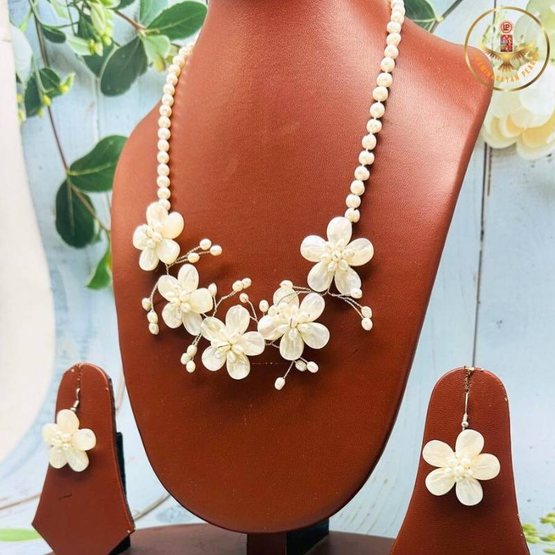 Inspired by the natural elegance of blooming flowers, this pearl necklace features a series of luminous pearls carefully arranged around or within intricately crafted floral settings. Each “flower” is thoughtfully designed using shimmering petals made from mother-of-pearl, resin, or metal and accented with a pearl at the center, symbolizing purity, grace, and renewal.
