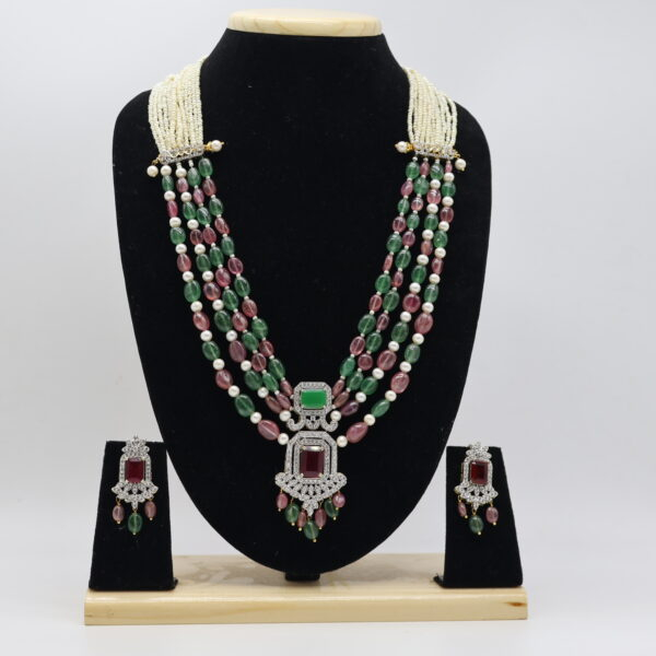 Crafted with genuine real pearls, each pearl has been carefully selected for its purity, luster, and smooth finish. The pearls are round in shape, providing a classic and symmetrical look that enhances the beauty of the necklace. With a very good (AAA) quality rating, these pearls ensure superior shine, durability, and elegance that lasts for years. The white pearls, measuring 3-4 mm, offer a subtle yet captivating glow, complementing the vibrant sparkle of the embedded stones.